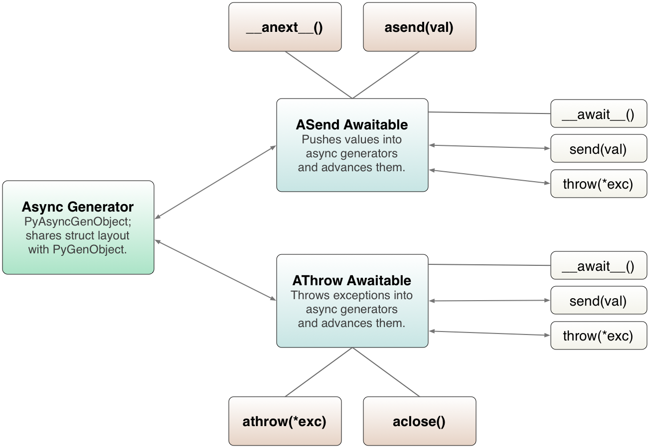 _PyAsyncGenWrappedValueobject is yielded, it is unboxed, and aStopIterationexception is raised with the unwrapped value as an argument. returnstatements in asynchronous generators raiseStopAsyncIterationexception, which is propagated throughPyAsyncGenASend.send()andPyAsyncGenASend.throw()methods.